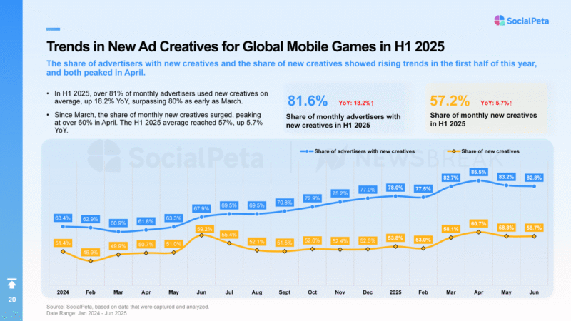 New advertiser activity in H1 2025 showed strong momentum. On average, over 81% of advertisers released new creatives each month, an 18.2% year-over-year increase. After March, this proportion consistently remained above 80%. The share of new creatives also saw significant growth, peaking at over 60% in April and averaging 57% across the period, up 5.7% YoY. The continued rise in both new advertiser participation and creative output points to an accelerated pace of creative iteration across the industry.