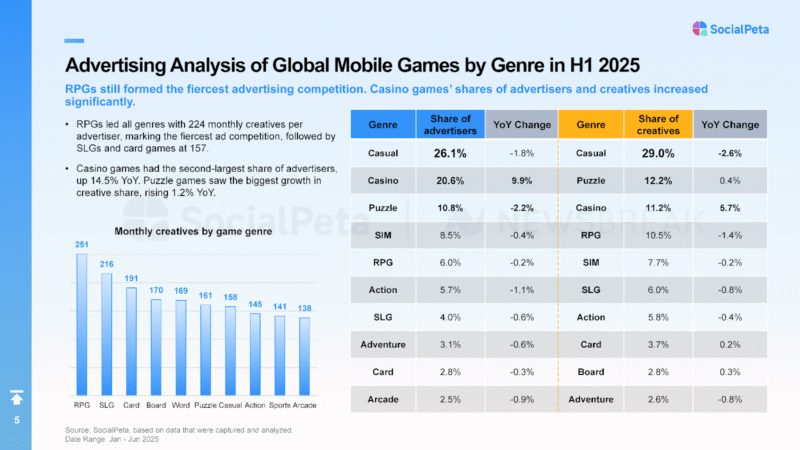 According to H1 2025 data on top-performing mobile game genres, RPGs remained the most competitive, averaging 251 creatives per month, the highest among all categories, followed closely by strategy games with 216 creatives. Casino games stood out with impressive growth: their share of advertisers rose to second place at 20.6% (+9.9% YoY), while their share of creatives ranked third at 11.2% (+5.7% YoY). In contrast, casual games saw a decline in both advertiser presence and creative output, signaling a shift in genre momentum.
